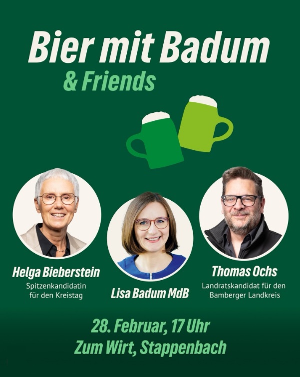 Lisa Badum (MdB), Helga Bieberstein (Spitzenkandidatin für den Kreistag) und Thomas Ochs (Landratskandidat für den Bamberger Landkreis), stehen vor Ort für Gespräche zur Verfügung. Kommen Sie gerne vorbei, um sich zu informieren!