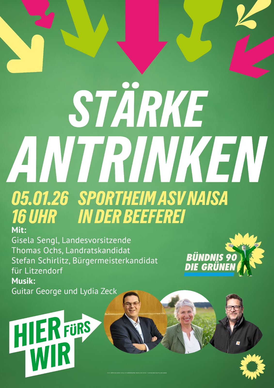 Zum Jahresauftakt laden die Grünen im Ellertal am 5. Januar 2026 zum traditionellen Stärke antrinken in das Sportlerheim des ASV Naisa ein. Nach dem großen Erfolg im letzten Jahr mit Toni Hofreiter als Redner kommt dieses Mal Gisela Sengl, die Landesvorsitzende der Grünen in Bayern, nach Litzendorf, um in das Wahljahr 2026 einzustimmen.